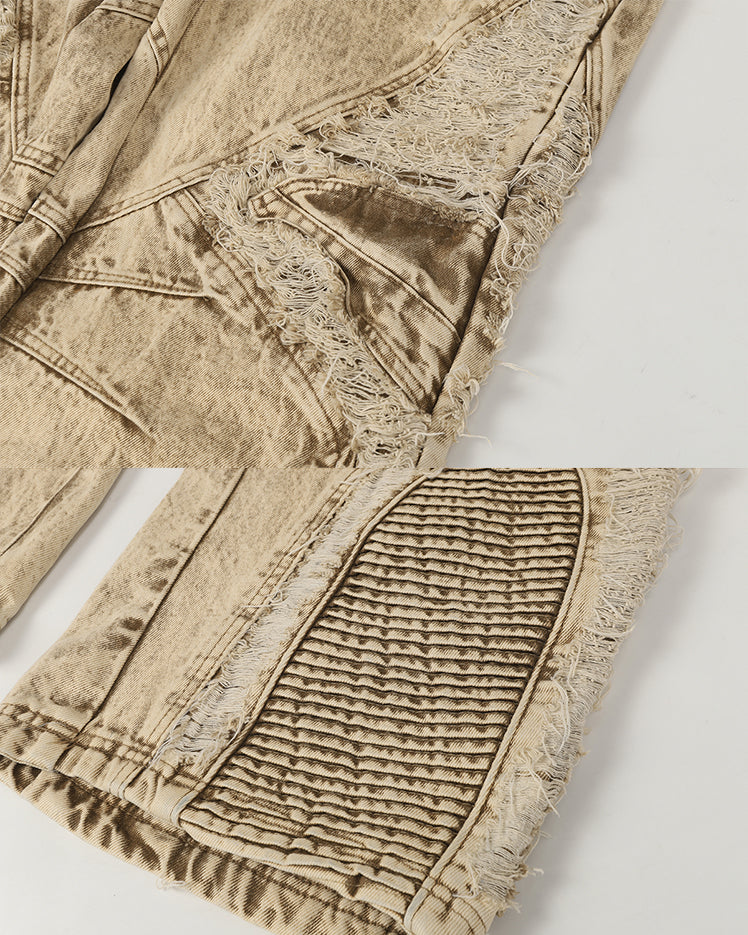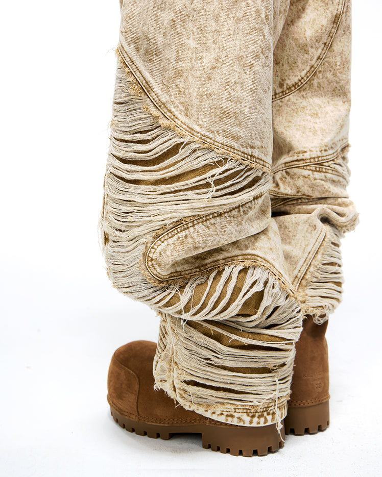 Wax-dyed texture, distressed and ripped details, washed vintage finish, straight or loose fit, classic five-pocket design, bold retro aesthetic with street-style edge