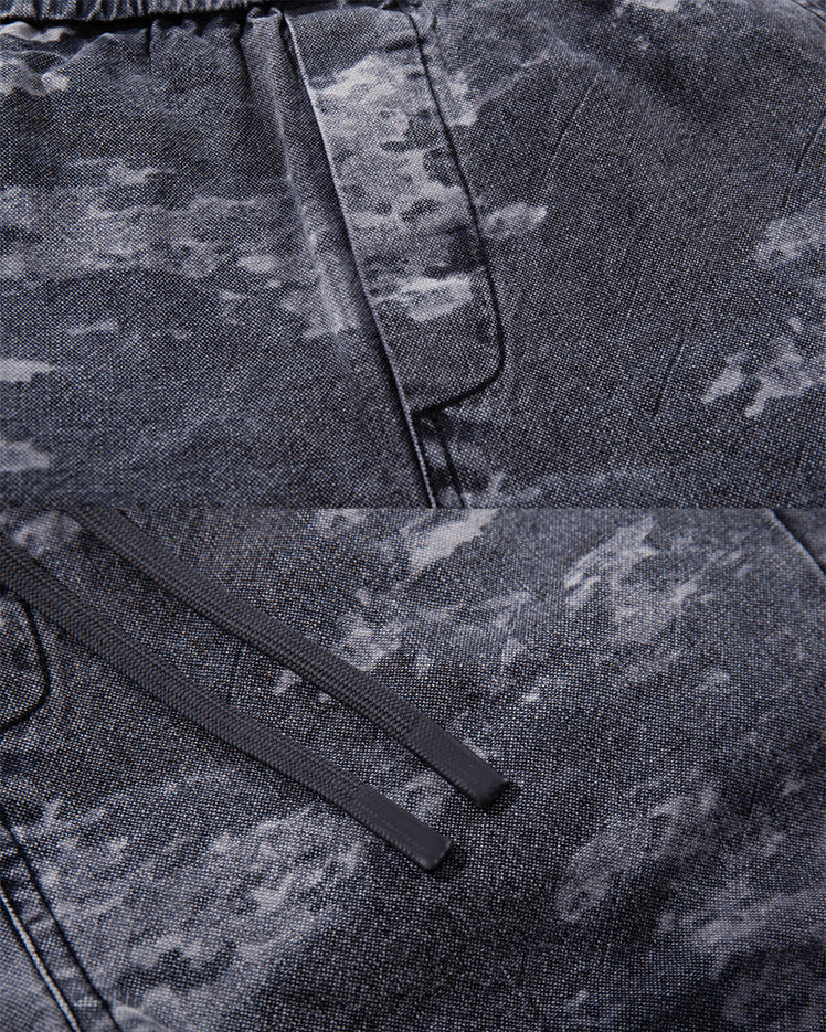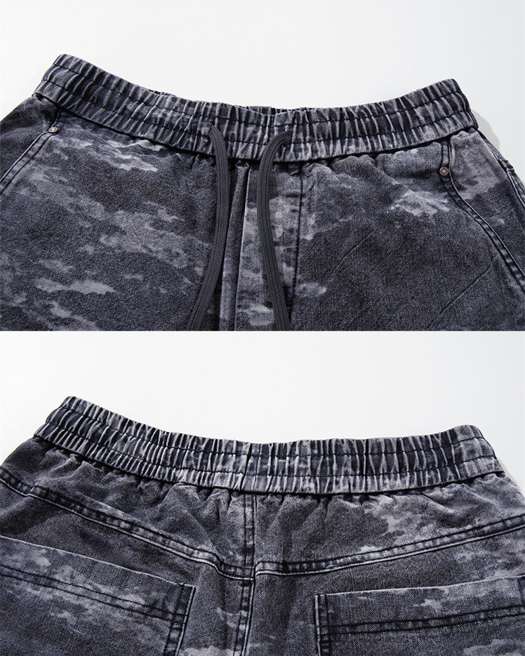 Gradient blue camouflage pattern, scimitar-style curved leg design, adjustable drawstring waist, multiple pockets, relaxed fit, lightweight fabric, trendy street vibe