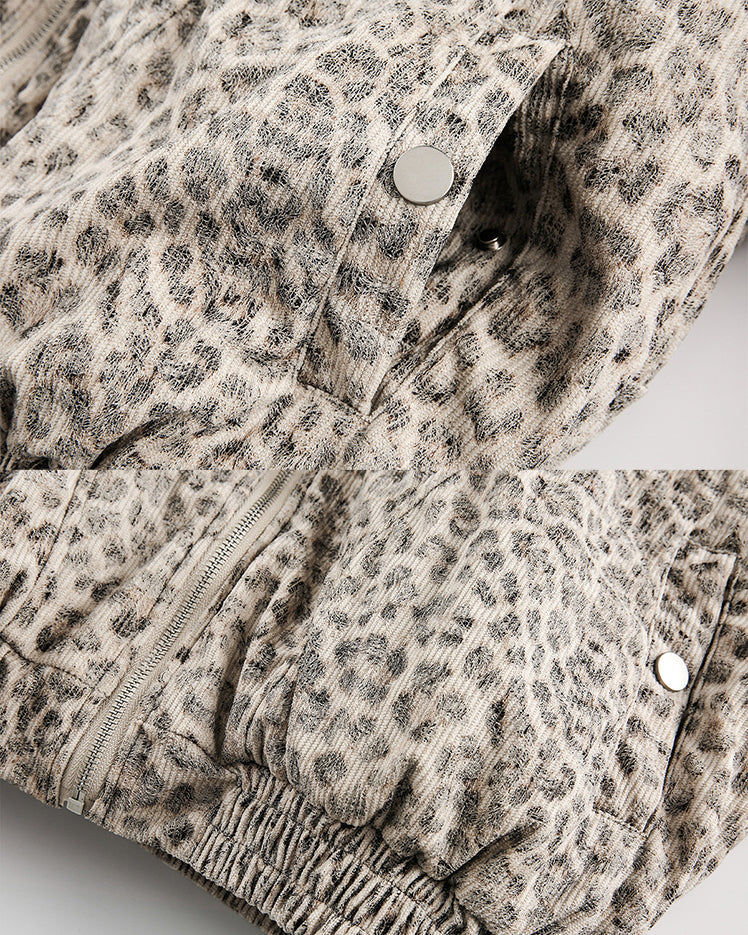 Bold leopard print, quilted padding, zip-up front, stand collar, ribbed cuffs and hem, relaxed fit, trendy street-inspired aesthetic
