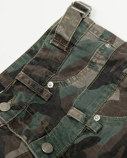 Camouflage print, wide-leg fit, multiple pockets, distressed edges, double waist design, utility style